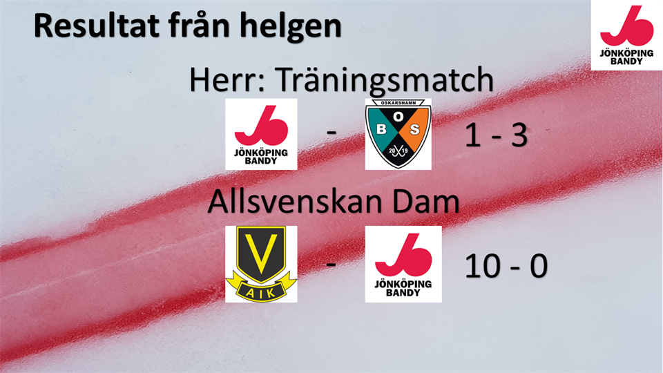 JB Dam fick känna på hur det är att möta spelare på landslagsnivå! Matchen slutade hela 10-0 till det kombinerade laget från Västerstrand/Örebro. JB hade inför start en rad återbud med förkylningar. Trots siffrorna så stod JB upp bra och kämpade väl men åt landslagsspelare är det inte mycket att göra. Kul få möta så bra motstånd och få "en målbild"! Nu är isen spräckt och vi får vänta på det första JB-målet Det kan vi ju gärna göra efter 12 år, en vecka eller två (eller tre) spelar ingen roll. Det viktiga var att komma igång! JB Herr genrepade mot Oskarhams BS - en mostståpndare som spelar i Div 1 (JB i div 2) och som vann Stinsen cup förra helgen. Inte helt illa genrep, knapp förlust med 1-3. Och nu kan vi äntligen börja träna på vår arena! Isen ligger!